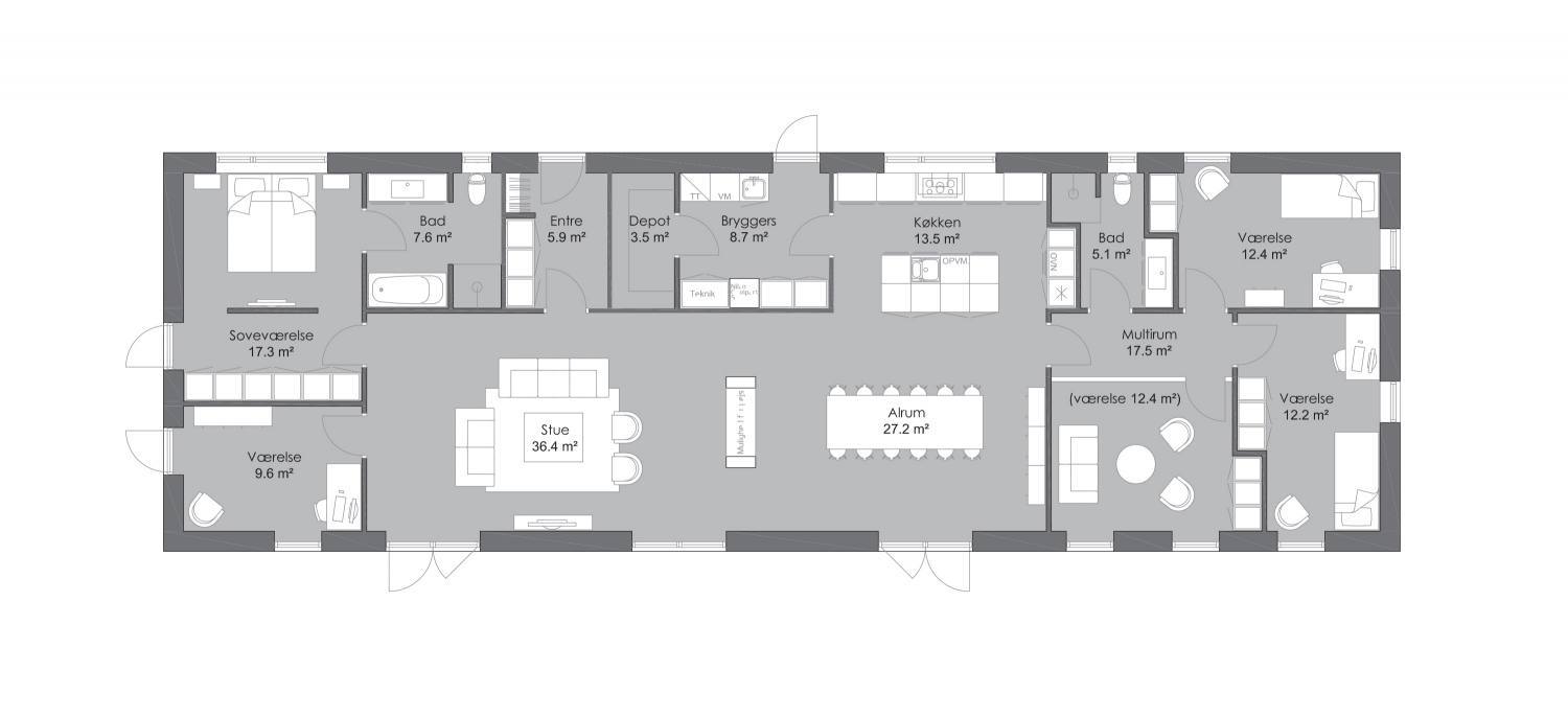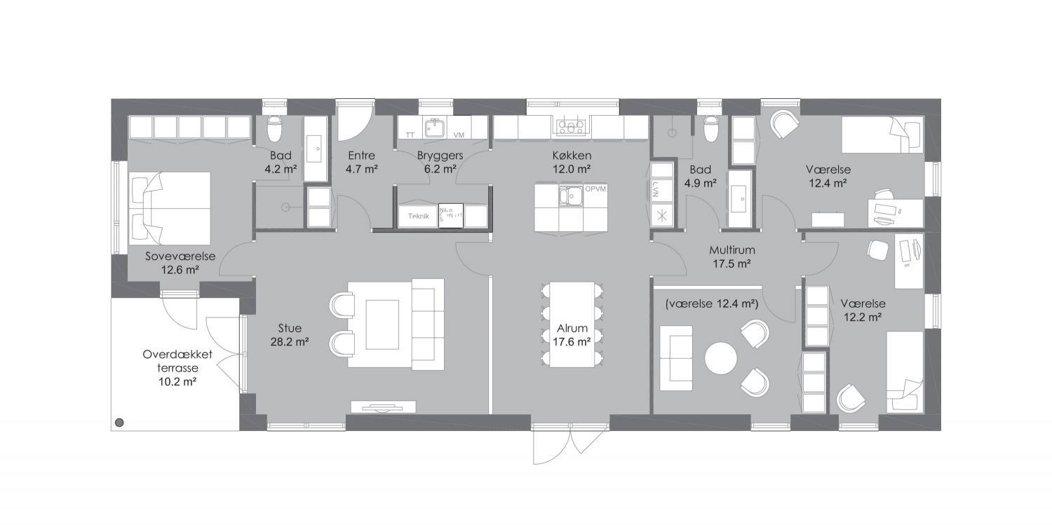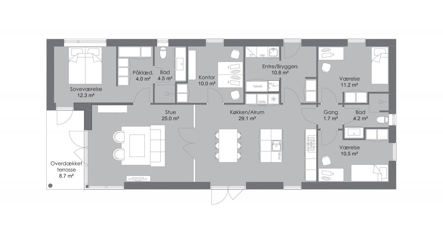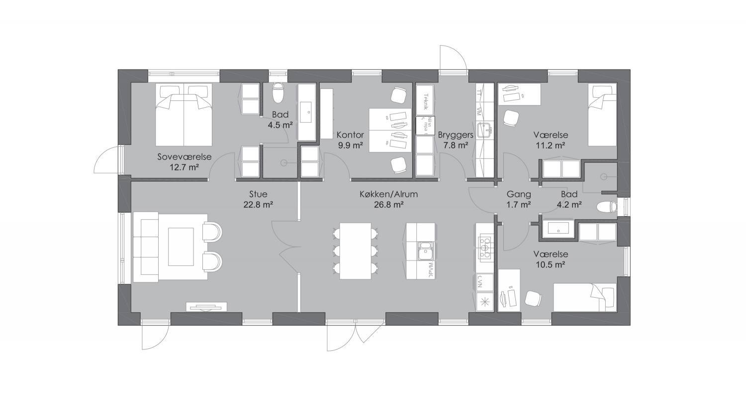 Længehuset er den klassiske og billige løsning på en bolig med høj funktionalitet. Den klassiske aflange form passer perfekt til den smalle grund og uden at du behøver at fravælge en integreret dobbelt vognport eller en dejlig overdækket terrasse. Der er plads til dem begge i hver sin ende af huset.